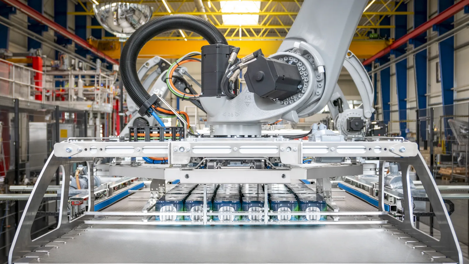 El paletizador apto para líneas destaca también por su versatilidad. Puede trabajar con los tres segmentos clásicos de envases: lata, PET y vidrio, así como con todos los formatos de palet habituales. Además, esta solución robótica está diseñada para una larga vida útil y preparada para el futuro, con un mantenimiento especialmente reducido.
