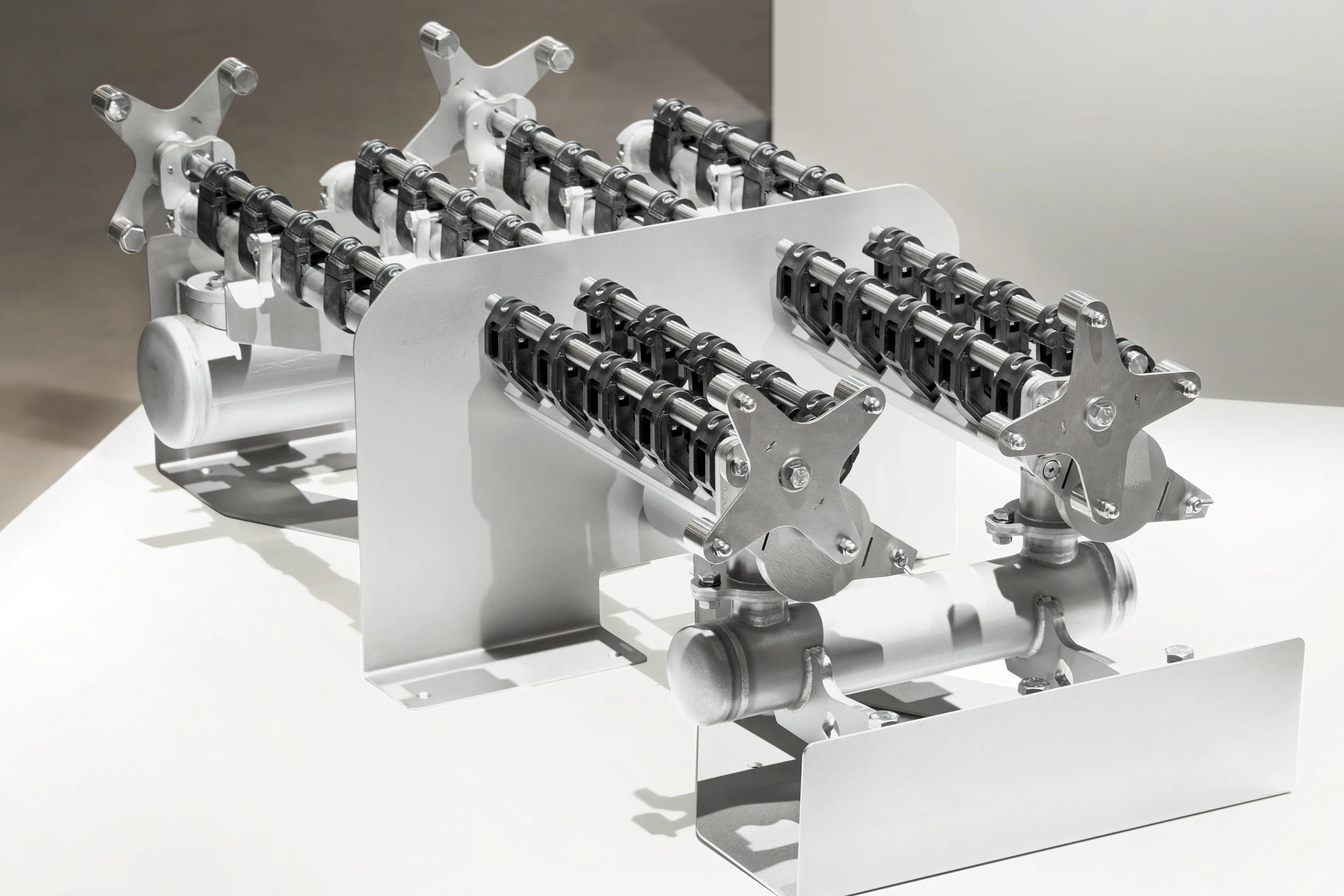 El sistema de pulverización, rediseñado desde cero, se caracteriza por un formato mucho más compacto y un mantenimiento más fácil. Soltau explica su función: “Las pulverizaciones se utilizan tanto en la fase de prelavado y precalentamiento al inicio de la máquina y de forma aún más relevante, al final de la misma. Aquí se utilizan para el aclarado final del interior de las botellas y para el enfriamiento posterior del cuerpo de la botella.” ¿Cuáles son las mejoras concretas? “En lugar de dos tubos de pulverización, ahora cada módulo requiere solo uno”, señala Soltau. “Y en términos de mantenimiento, el nuevo sistema supone una clara ventaja para nuestros clientes, ya que incorpora menos piezas y permite una extracción lateral ágil y sin complicaciones.”